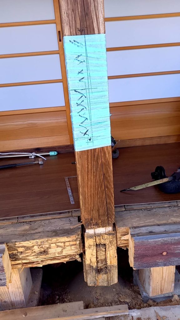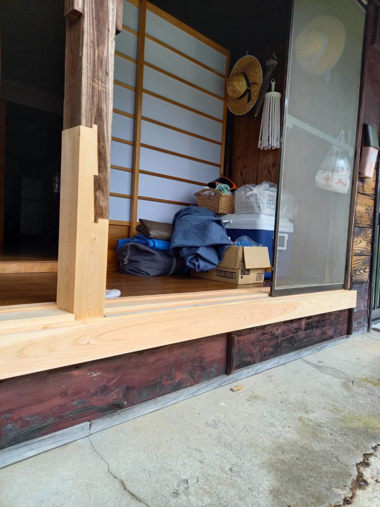 そして、熊野へお盆に帰ってきたいから、というお客様の後期待に応えるべく、柱の入れ換え(敷居交換も)作業をさせていただく事に。
