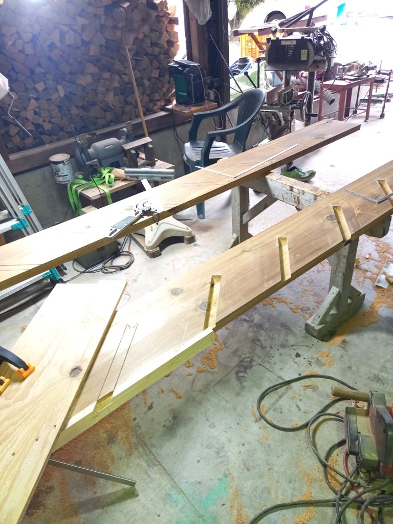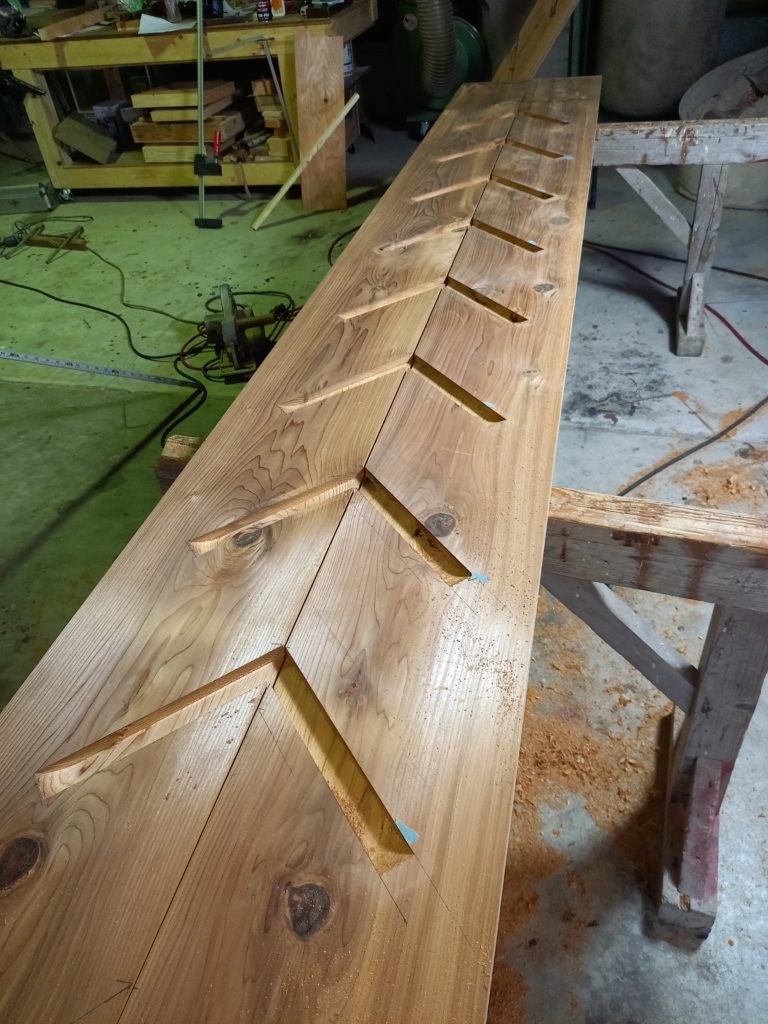 杉板で 階段製作。 最近は 階段もプレカットされた物が多いので 久々に原寸引いて 1から加工しました! めちゃくちゃ 楽しいです