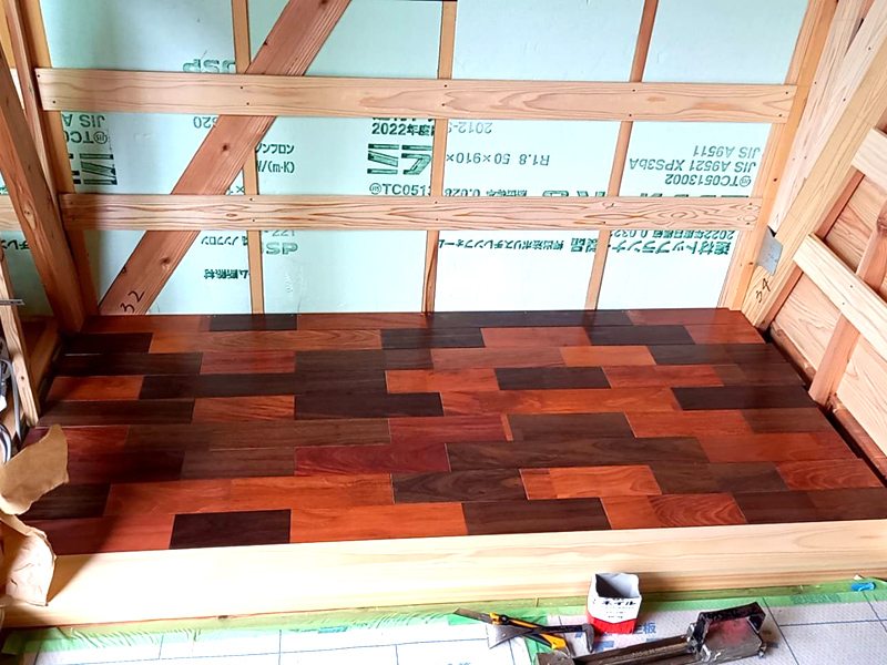 内装一例・無垢の小幅板張り(床)と壁断熱材施工
