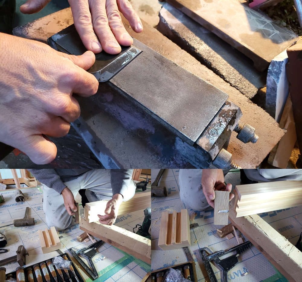 大工作業の要である刃物の手入れは毎日欠かせません。木が美しく仕上がるのは技術に加えて道具を慈しむ心があるからです。
